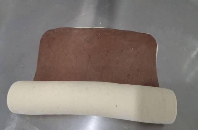 8、然後將可可面團重疊於白色面團上,搟薄至厚度5毫米,表面噴水霧順勢卷起。