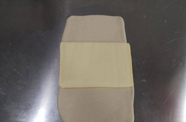 5、取出一公斤的那個面團。搟長,包入片狀黃油。