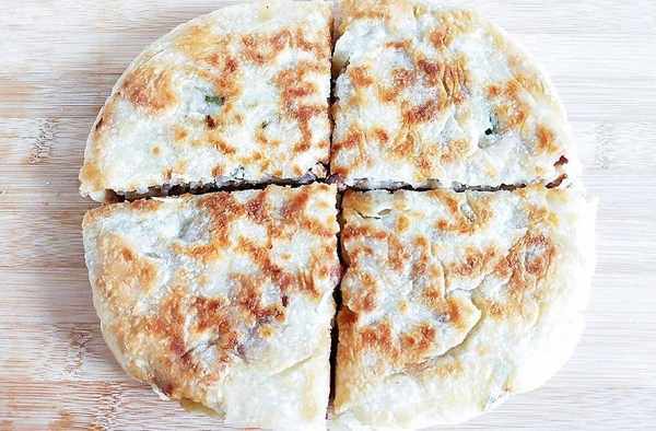 10、待兩面金黃,表皮鼓起時,千層蔥花肉餡餅就烙好啦