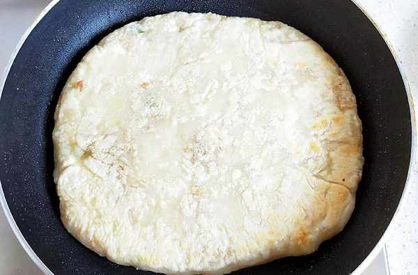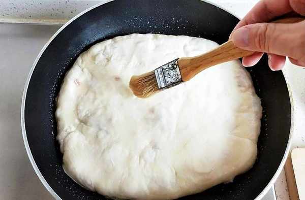 9、待底面定型,翻面烙至,同樣,再刷上水油,蓋上鍋蓋,小火烙至3分鐘