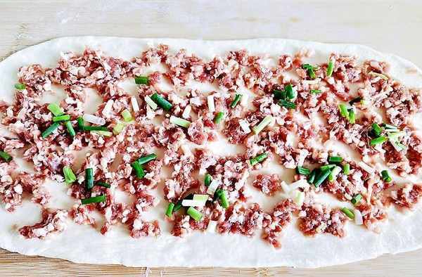 3、餳好的面團,搟成大薄片,先在上面刷上一層油,在均勻碼上調好的肉餡,這時再將切好的蔥花均勻撒在肉餡上。蔥花不要切的太碎,稍微大一點,這樣起到的作用是:既可以起到支撐的作用,使烙出來的餅更加的有層次感;因為餅裡有空隙,還能在烙至的過程中,讓餅的內部均勻受熱