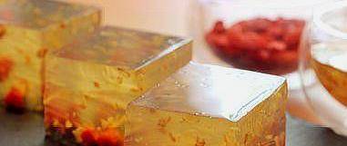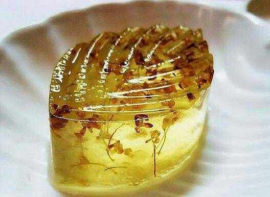 3、最後等桂花糕溫度稍微降下來後(降溫成半凝固時需要輕輕攪拌一下,以防桂花沉底),再把桂花糕倒入準備好的模具中,然後再冷卻幾分鐘,直至成室溫時,放入冰箱中冷藏成固定型即可開吃;