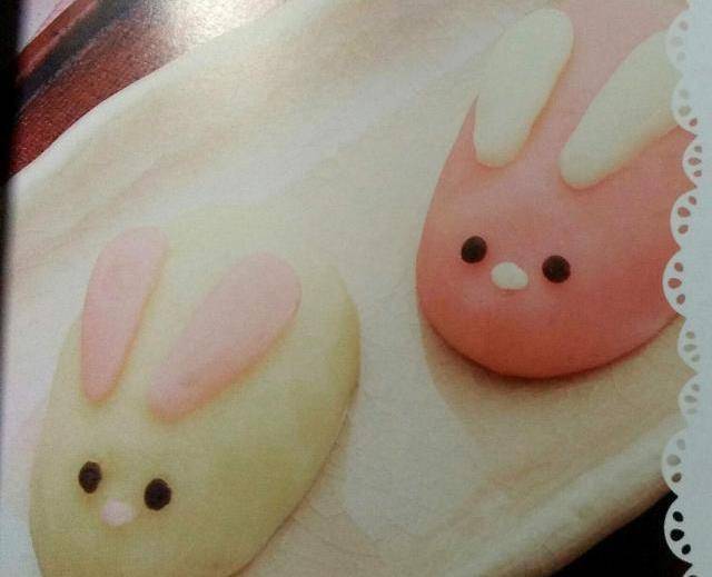 5、最後將面團分成兩份,一份加入彩粉揉勻,另一份不加,然後用不同顏色捏成兔子的耳朵、鼻子、嘴巴就做好啦。