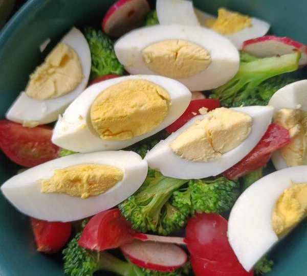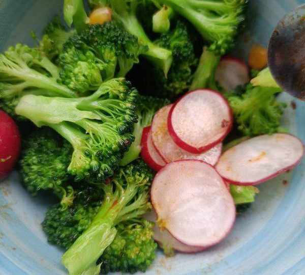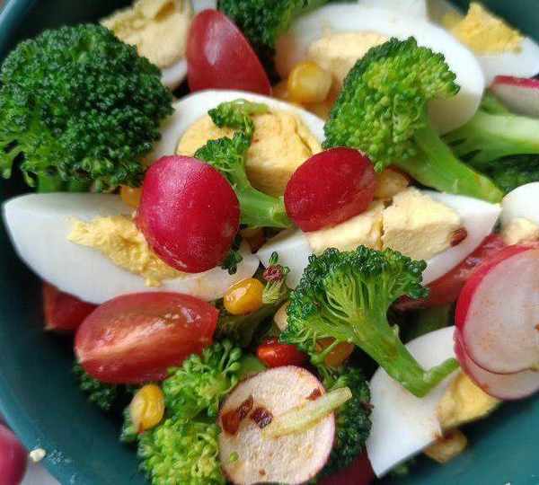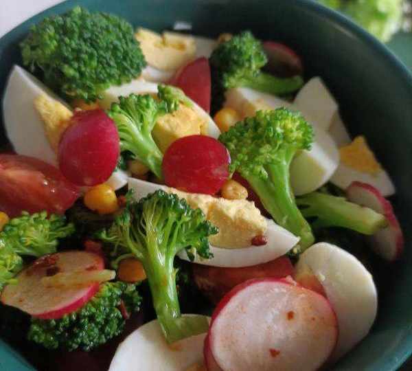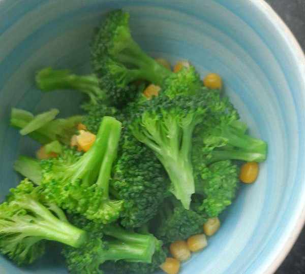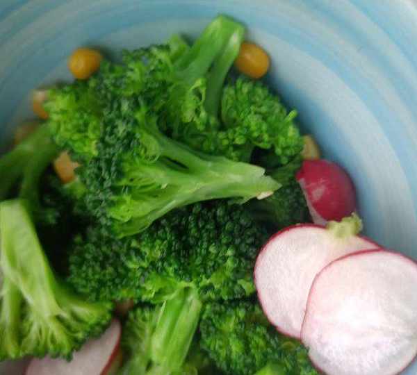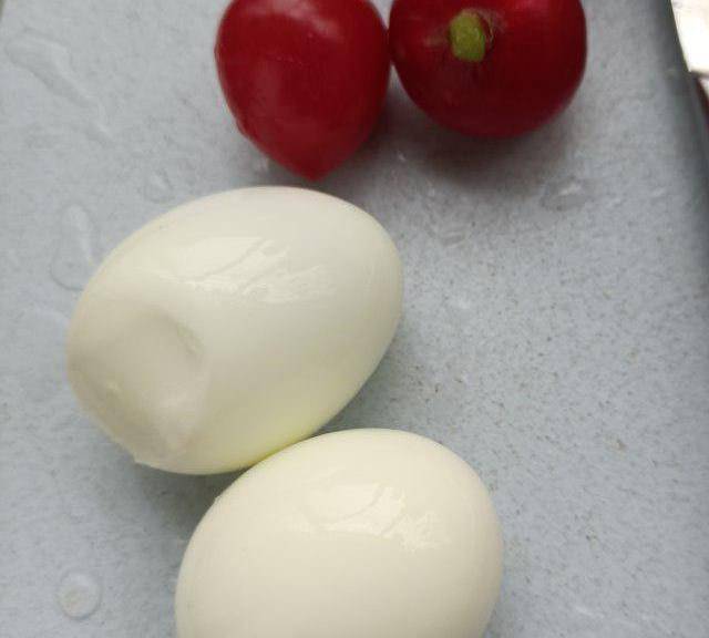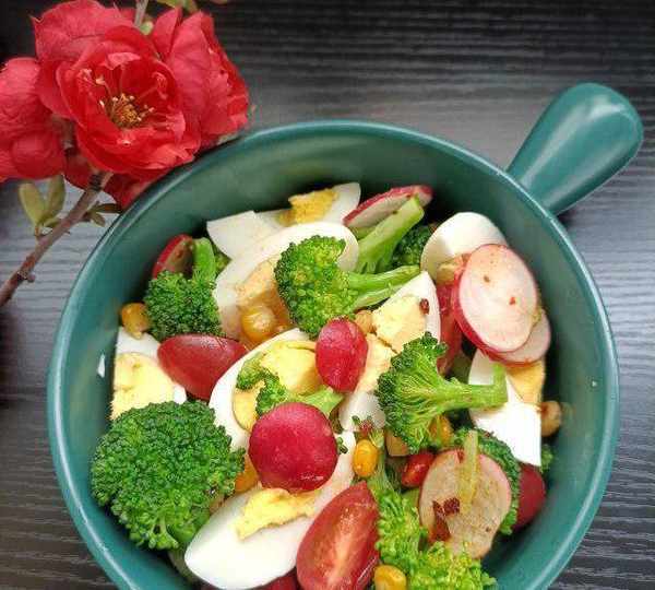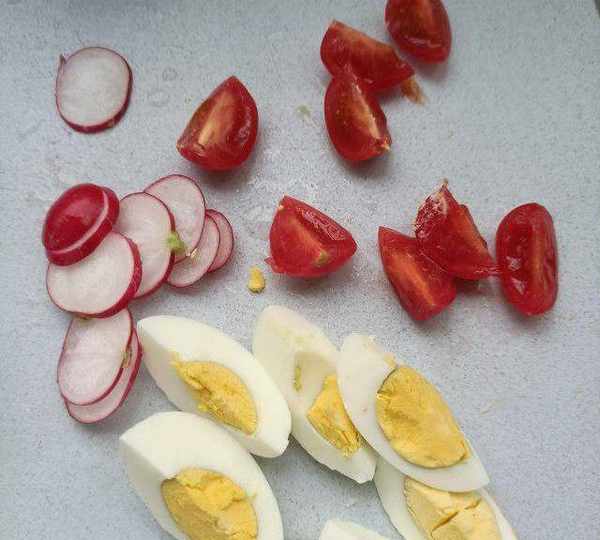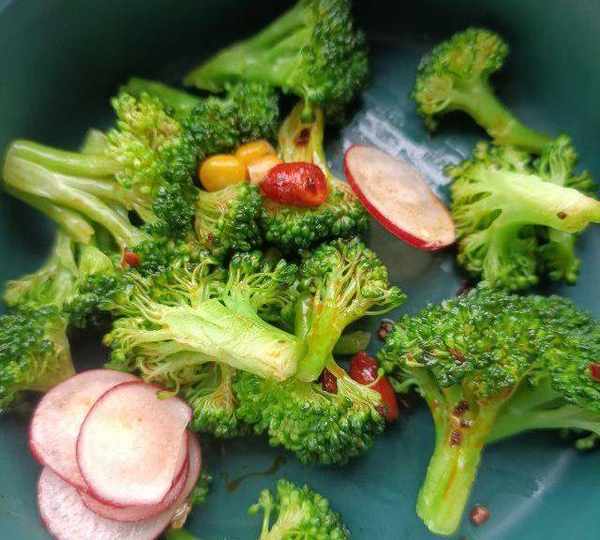 原料:雞蛋、西蘭花、櫻桃蘿卜、小番茄、玉米粒、油辣子、食鹽。