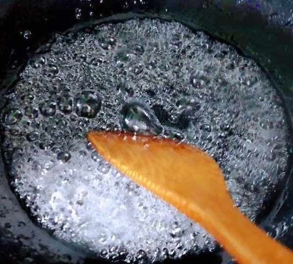 第8步、鍋中倒入清水和冰糖比例是一比一加熱不停攪拌至起泡泡即可。