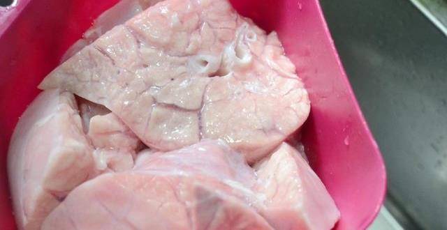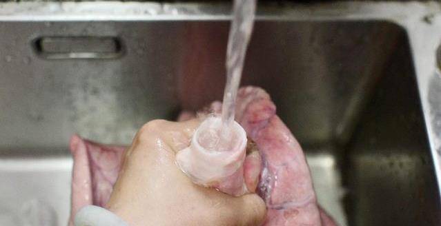 1.買回來的豬肺從喉管地方用活水不斷沖洗,到豬肺鼓起來然後倒掉裡面的血水,如此反復幾次到血水變得幹凈就可以瞭。