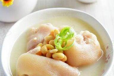 做法:黃豆提前浸泡2小時,生薑切片,和豬蹄放入砂鍋中用大火燒開後再轉小火慢燉,等到豬蹄快熟的時候加入食鹽和蔥花繼續燜半小時分鐘即可。