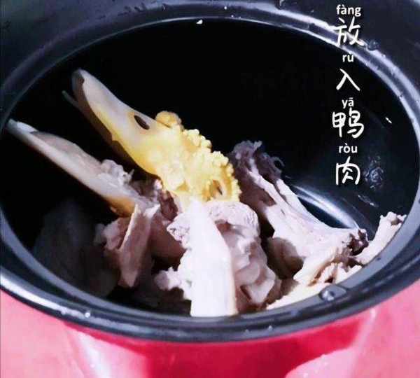 第7步、倒入鴨塊,放入薑片2克,料酒10克。