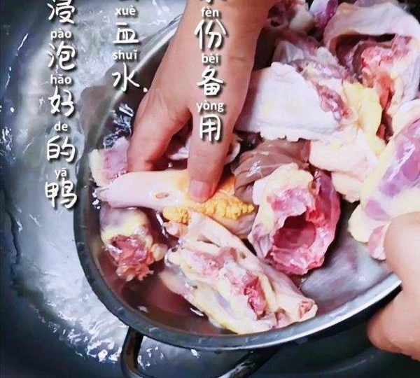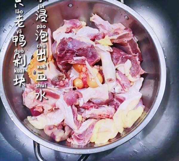 第1步、把老鴨剁塊,放入盆中,加水浸泡半小時。