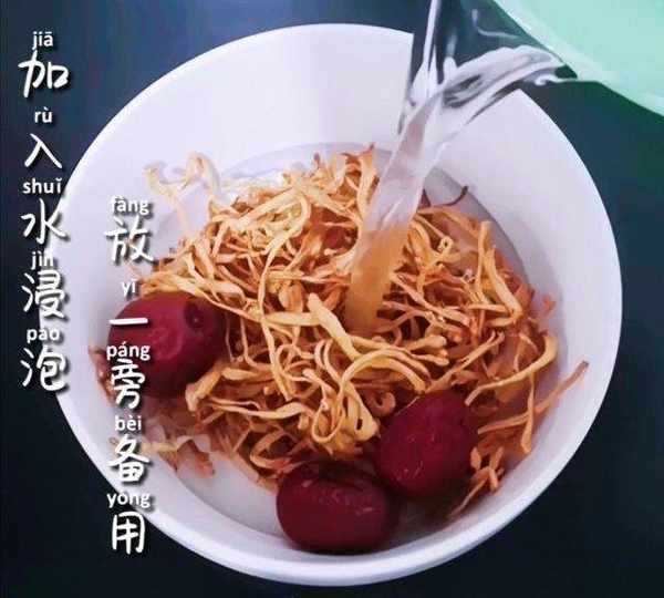 第2步、蟲草花和紅棗,放入碗中加入溫水,泡發。