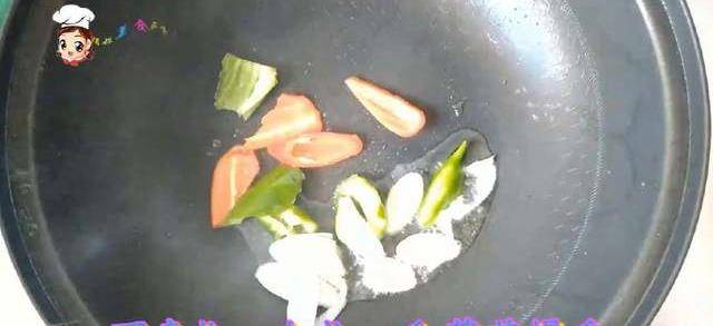 6;炒鍋留少許油,下青椒、紅椒、和蔥花爆香