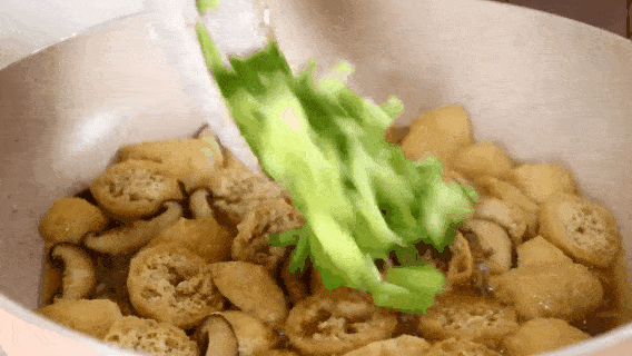 4.放一勺鹽和白糖,下入油豆腐,開小火燉3分鐘。