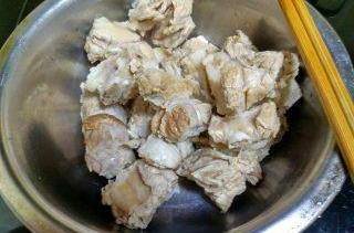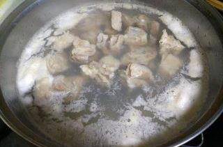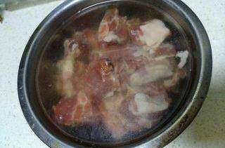 小鍋裡把排骨煮沸,去掉煮排骨時的泡沫。