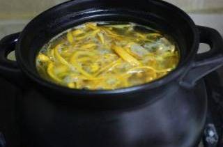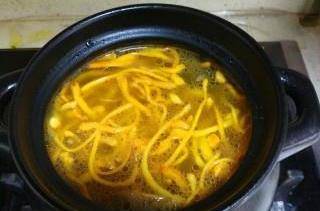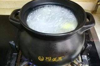 砂鍋中註入適量的清水。清水要多加一些不要中途加水。把生薑洗凈,改打成片狀。