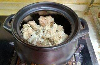 把排骨倒入砂鍋裡,大塊的骨頭放在下面,小的放在上面。