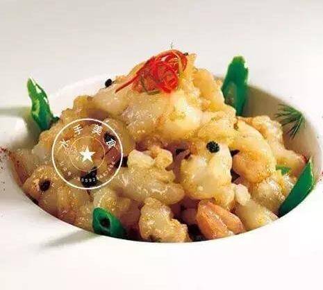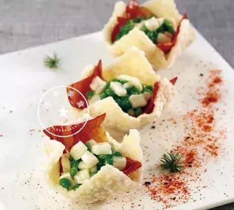 3. 鍋留底油,倒入主輔料加海真滑炒汁翻炒均勻,出鍋盛入造型鍋巴中,裝盤,點綴西班牙火腿即可。