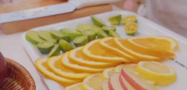 2、 將洗好的水果瀝幹水分,記得選擇熟食菜板來切哦,才能保證做出的水果衛生幹凈。將橙子、黃檸檬、青檸檬切成片,其他的切成小塊後備用。