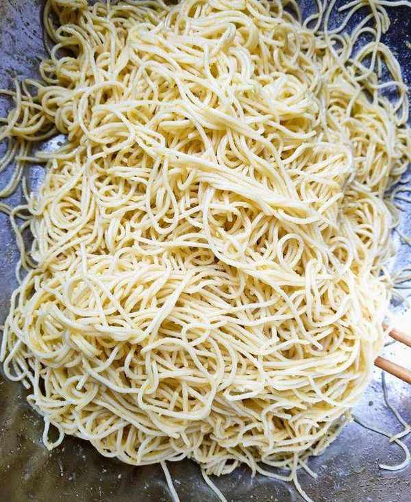 2.把面條撈起來放入盆中,倒入菜籽油,邊倒邊伴,等面成黃色後,就可以瞭