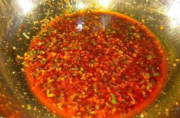 3.薑,蔥,蒜,香菜切粒,開始調味,放入辣椒油,花椒粉,香油,雞精,味精,鹽,生抽,少許老抽,白糖,陳醋,攪拌均勻