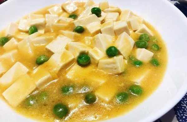 配料:一塊豆腐,咸蛋黃醬,豌豆,鹽和糖。
