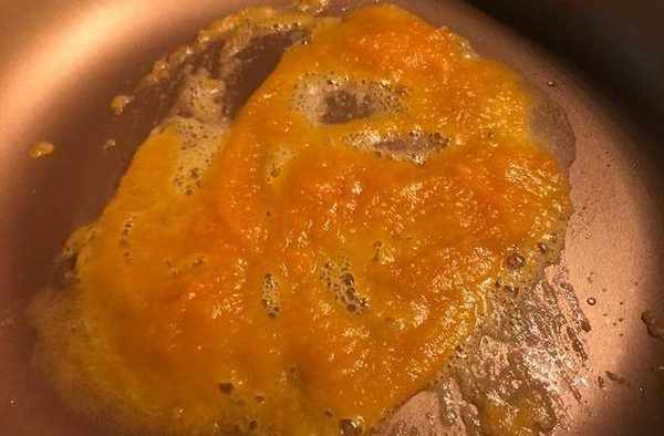 步驟3:將油從鍋中燒掉。當油溫為60%時,加入鹽漬的蛋黃醬並油炸。如果沒有鹽漬蛋黃醬,則可以用煮熟的蛋黃煎炸。