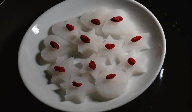 這是上次咳嗽蒸的冰糖蘿卜,止咳、潤肺、去火效果不錯,僅限於肺熱咳嗽,流清鼻涕癥狀、咳嗽白痰不適合吃冰糖蘿卜,小時候老人告誡的事,一直記著,土方法翻新,蘿卜切好看點,對付小孩最有效,小孩吃就不要放枸杞子蒸。