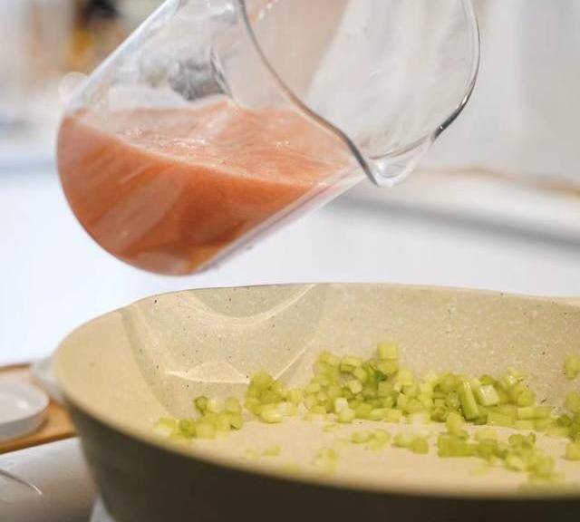 第8步、再放入芹菜丁煸炒,倒入番茄醬,加少許鹽、糖、黑胡椒調味。