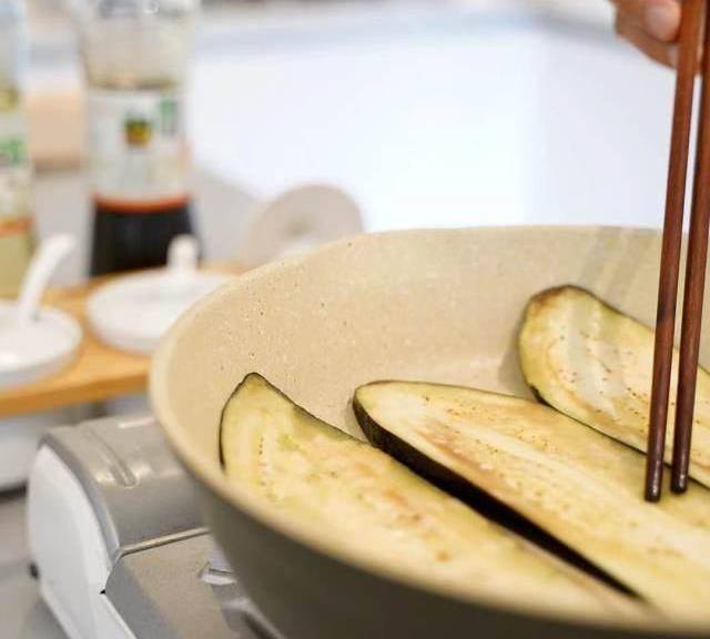 第7步、鍋中倒油,放入茄子片煎軟取出。