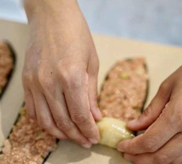 第9步、把醃好的新膳肉在茄子片上薄薄地塗一層,卷成茄子卷。