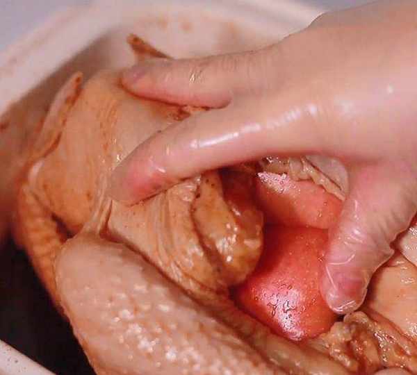 第4步、醃制好後,在雞肚子裡塞入蘋果,然後用牙簽封住屁股,這可以讓造型更飽滿,而且烤出來還有甜甜的香味。