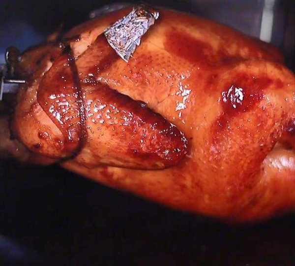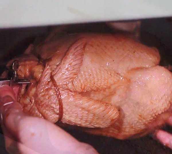 第5步、將雞用烤雞架架好,用繩子固定一下,然後放入提前預熱好的烤箱,采用旋轉烘烤,200度烤30分鐘,這裡可以根據自己的情況,調節溫度跟時間。
