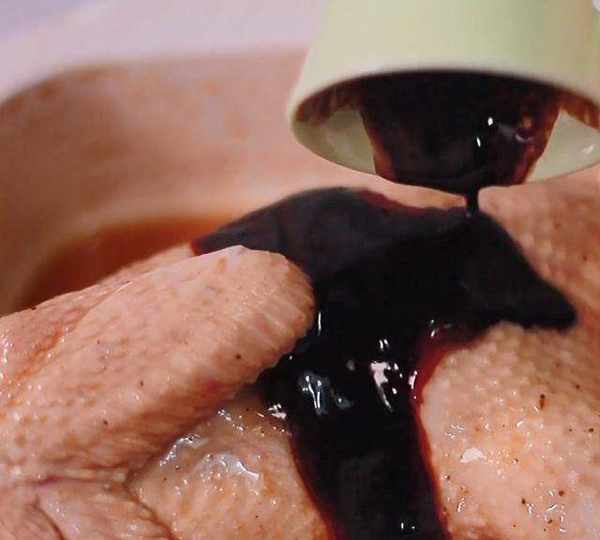 第3步、將雞從水中取出,用廚房餐巾紙擦掉雞表皮的水分,然後倒入調制的入味醃料,全身塗抹均勻,然後再加點蠔油、老抽,塗抹均勻,蓋上蓋子醃制四個小時。