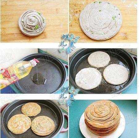 18.烙好的旋餅疊放在盤子上,隔著屜佈從側面把餅推出層次。