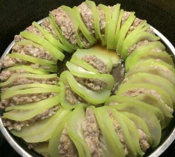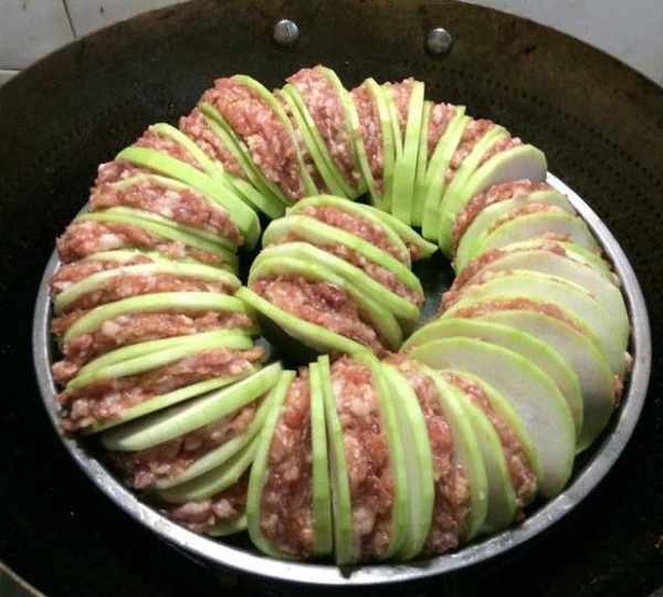 1.肉餡可以多樣,一般我喜歡香菇豬肉,因為傢裡剛好沒有香菇瞭,用薑替代瞭。2.記得肉餡一定要放油,不然起不到去腥作用,放亦舒堂火麻油味道挺特別的,喜歡。3.瓜片不用切太厚,如果刀工不錯的話,可以切薄點4.建議用不銹鋼碟子蒸,導熱快些,菜也容易蒸熟。