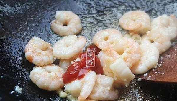 【材料】:蝦仁220克、番茄醬2勺、鹽適量、糖1小勺、料酒1勺、蒜3瓣、
