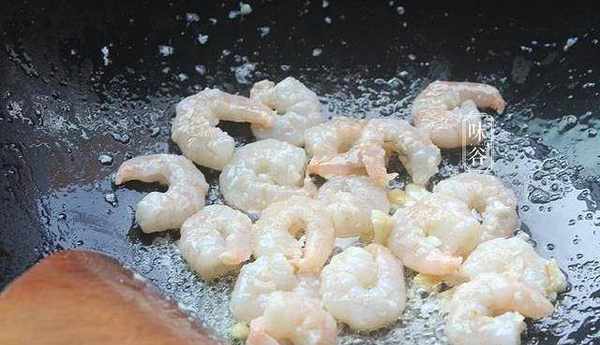 5、熱鍋下油,放蒜末爆香後,倒入蝦仁迅速翻炒;