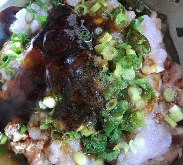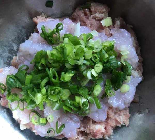 第2步、蝦仁用絞肉機絞碎放入鮮肉中,放入蔥末。
