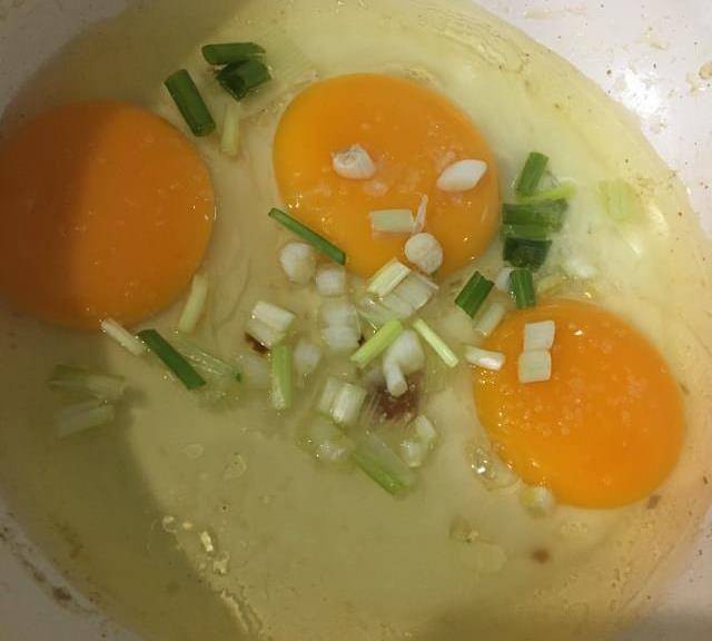 第4步、熱鍋入油,打入雞蛋,放入蔥白。
