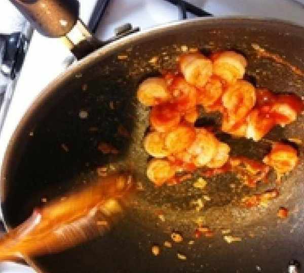 第7步、往鍋裡加入蝦仁及雞蛋,撒少許鹽,根據口味加少量水。如果喜歡酸味重點的,起鍋前可以加一點番茄醬。