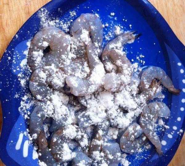第2步、蝦仁洗凈背部剖開挑去蝦線,蘸少許淀粉。
