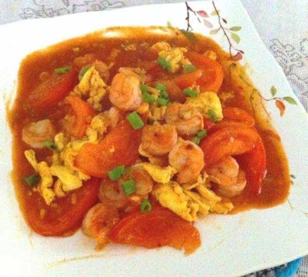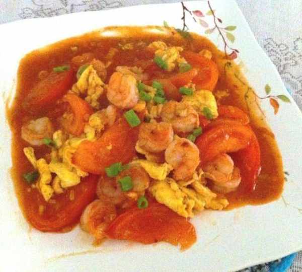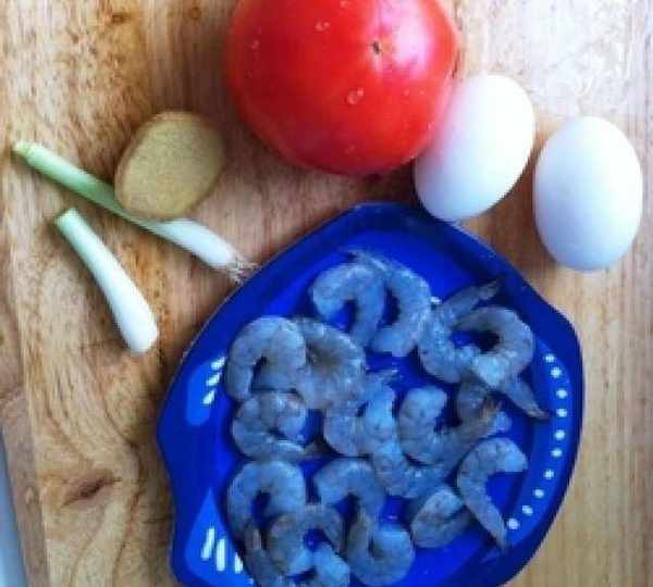 原料:蝦、西紅柿、雞蛋、蔥。