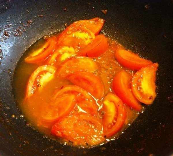 第6步、熱鍋中加少許油,大火翻炒西紅柿片1分鐘。轉小火,加一湯匙水蓋上鍋蓋煮一會兒,讓西紅柿的汁熬出來一些。