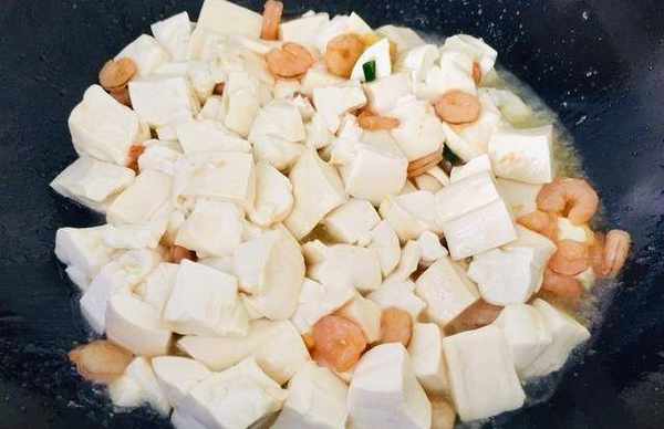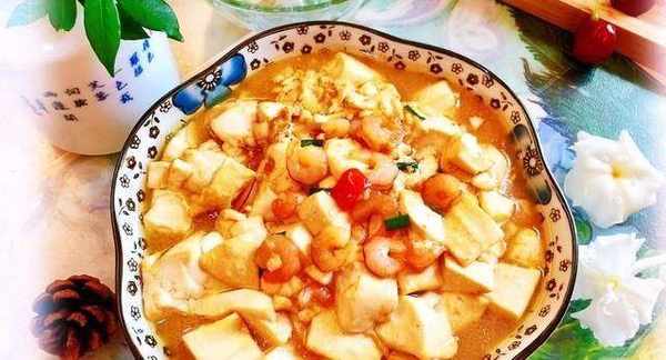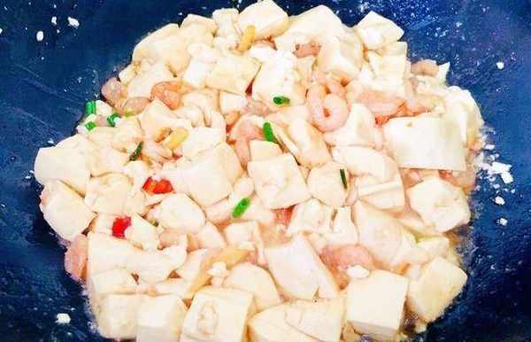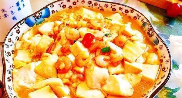 配料:一塊豆腐,100克蝦,兩湯匙料酒,適量的淀粉,醬油,鹽,切碎的蔥,薑和味精。