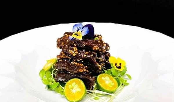 鍋留底油放入所有的調料熬制一下,放入炸好的牛肉翻炒均勻,撒入白芝麻出鍋晾涼裝盤即可