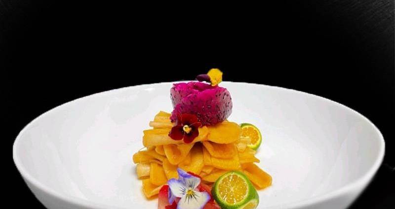 醃制好的蘿卜放入盤中,用火龍果花和其他的食用花草點綴即可