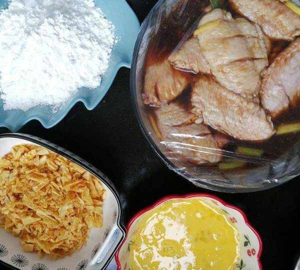 第8步、準備兩個打散的雞蛋、淀粉、大波浪薯片(薯片用搟面杖敲碎)。