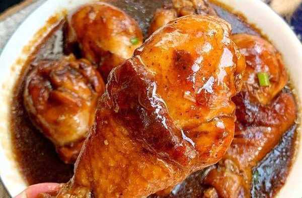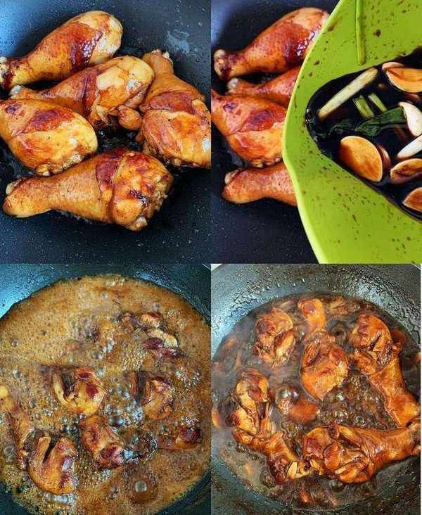 ⑶起鍋熱油,把雞腿放入鍋中,炸到兩面成金黃色,倒入剛出醃制剩餘醬汁,在加入半碗清水。