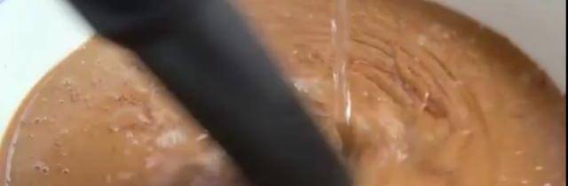 之後芝麻醬裡倒入開水,進行水代法使油水分離,比例是,芝麻醬:熱水=1:0.85,邊倒開水邊攪拌,芝麻醬會隨著攪動,變的越來越濃稠。