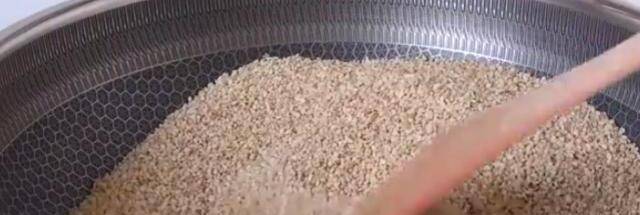 這時芝麻還不能出鍋,繼續不停翻炒,一直炒到稍有糊狀,芝麻略微發黑,但不能炒過,否則芝麻醬會發苦。這時關火出鍋晾涼。