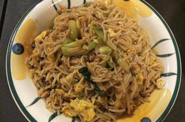 炒米粉:米粉用開水燙熟,過冷水瀝幹備用。小青菜切小條,便於炒熟,薑蒜切好,雞蛋劃好,加適量鹽。先煎好雞蛋,盛起備用。鍋中熱油,倒入薑蒜和幹辣椒,炒香。再倒入小青菜,炒一分鐘左右。倒入米粉,加入適量生抽和老抽,翻炒一會兒。加入炒好的雞蛋,加一點蠔油!
